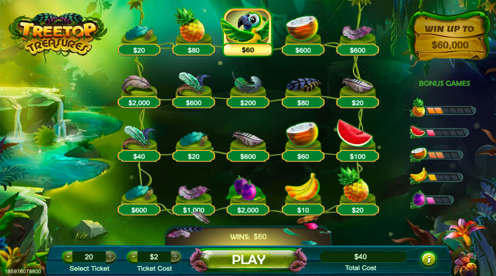 Spend just $0.05 and stand to win big money!Treetop Treasures is a fun symbol match game. Watch as falling fruit bounces around to strike buckets and multipliers. Enjoy immersive graphics and simple fun with the chance to win as much as $60,000 for as little as $0.05. Reveal a bird to win the prize shown and reveal a Golden Egg for more surprises!